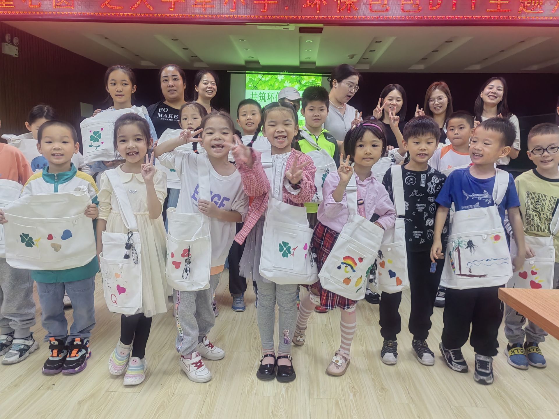 活动现场,老师通过PPT,围绕认识垃圾分类、保护环境的重要性、我们可以做些什么等方面知识为小朋友进行科普,引导小朋友们在日常生活中要重视低碳环保。并讨论如何养成少用一次性塑料袋、一次性杯子、一次性筷子等环保的好习惯。随后老师讲解了绘画帆布包的方法及步骤,分发帆布包和绘画颜料工具。让孩子们自由选择喜爱的方式进行涂鸦创作,激发孩子们的想象力和创造力,创作出属于自己的环保袋。经过一个多小时的涂画,一款款色彩缤纷的帆布包“出炉”了,造型别致的各种样式,让人爱不释手。孩子们还把自己的名字和年龄标注上去了,并相互展示自己的作品,告诉其他人这是属于自己的艺术作品。一副洋洋得意的样子,充满了小小“环保家”的骄傲。