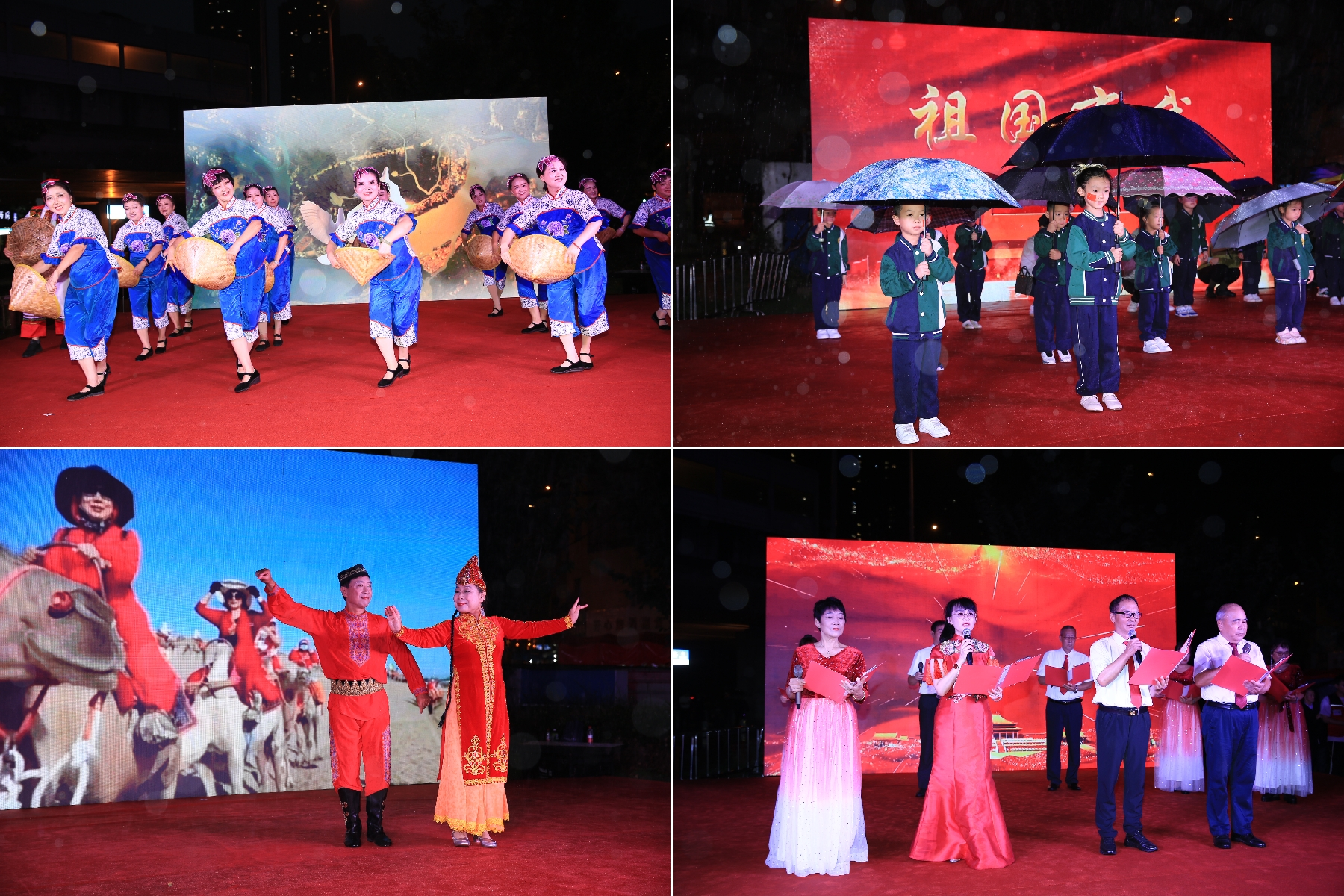 活动接近尾声,所有演出人员及居民观众们同唱《我和我的祖国》,共同挥舞着手中的国旗与荧光棒,细雨绵绵也阻挡不了大家的高涨的热情,在幸福的歌声中为当晚活动画上了圆满句号。