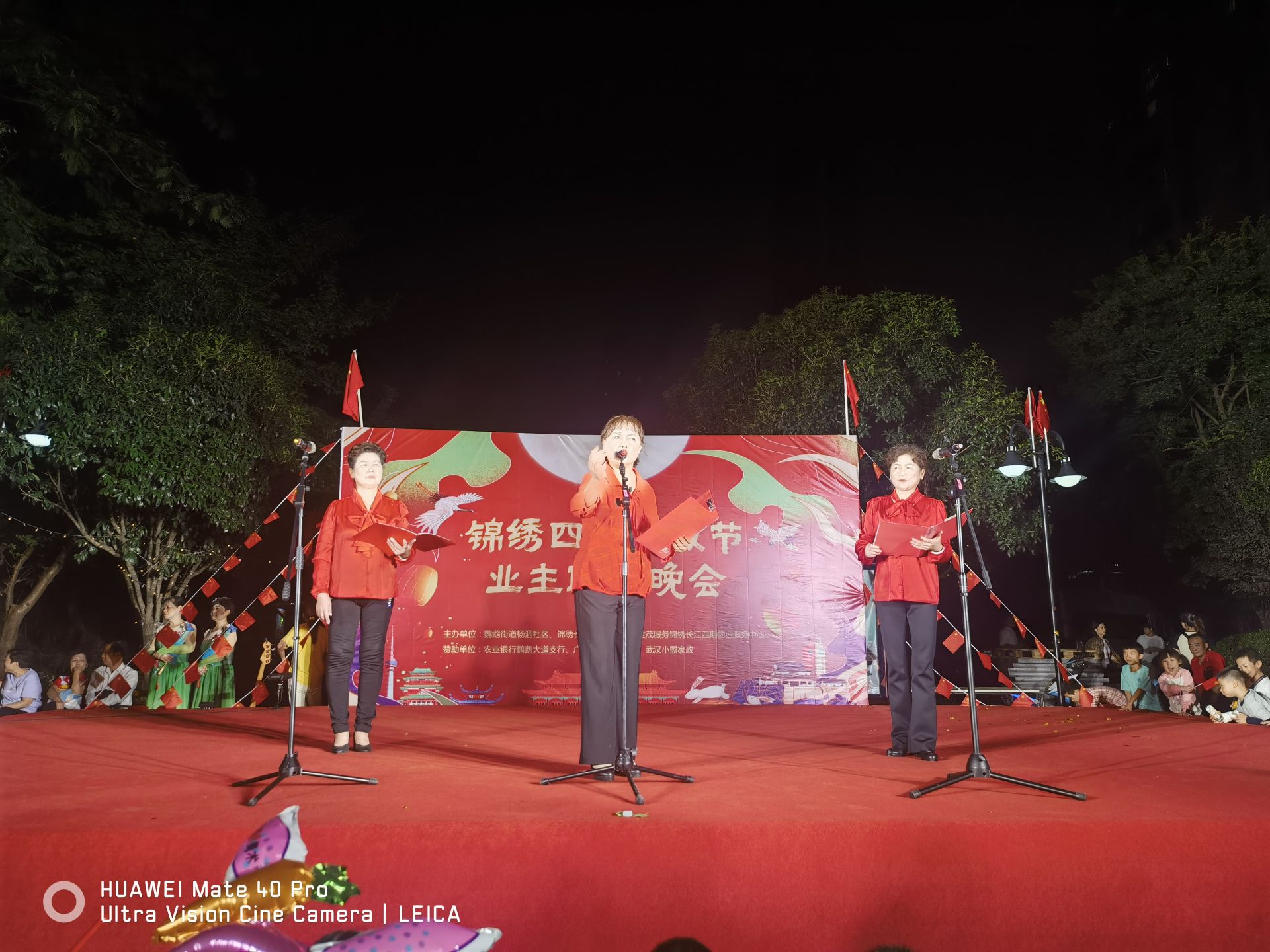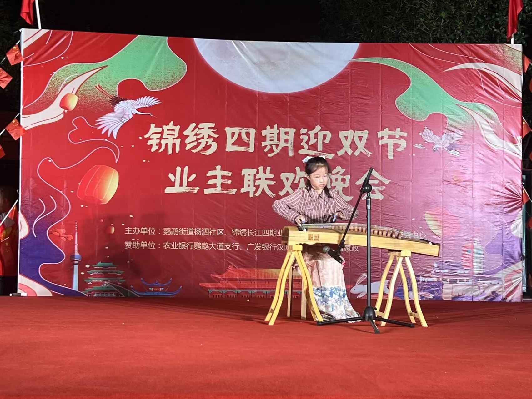 红旗漫卷千秋月,灯彩家国共此时。9月26日晚,锦绣长江四期人声鼎沸,热闹非凡。由武汉市汉阳区鹦鹉街道杨泗社区、锦绣长江四期业委会、锦绣长江四期物业服务中心联合主办的“迎中秋、庆国庆”文艺晚会正在隆重举行。节目涵盖歌舞,茶艺、乐队演出、三句半、古筝等多种艺术形式。社区居民登上舞台,载歌载舞,在欢乐中迎接“双节”到来。