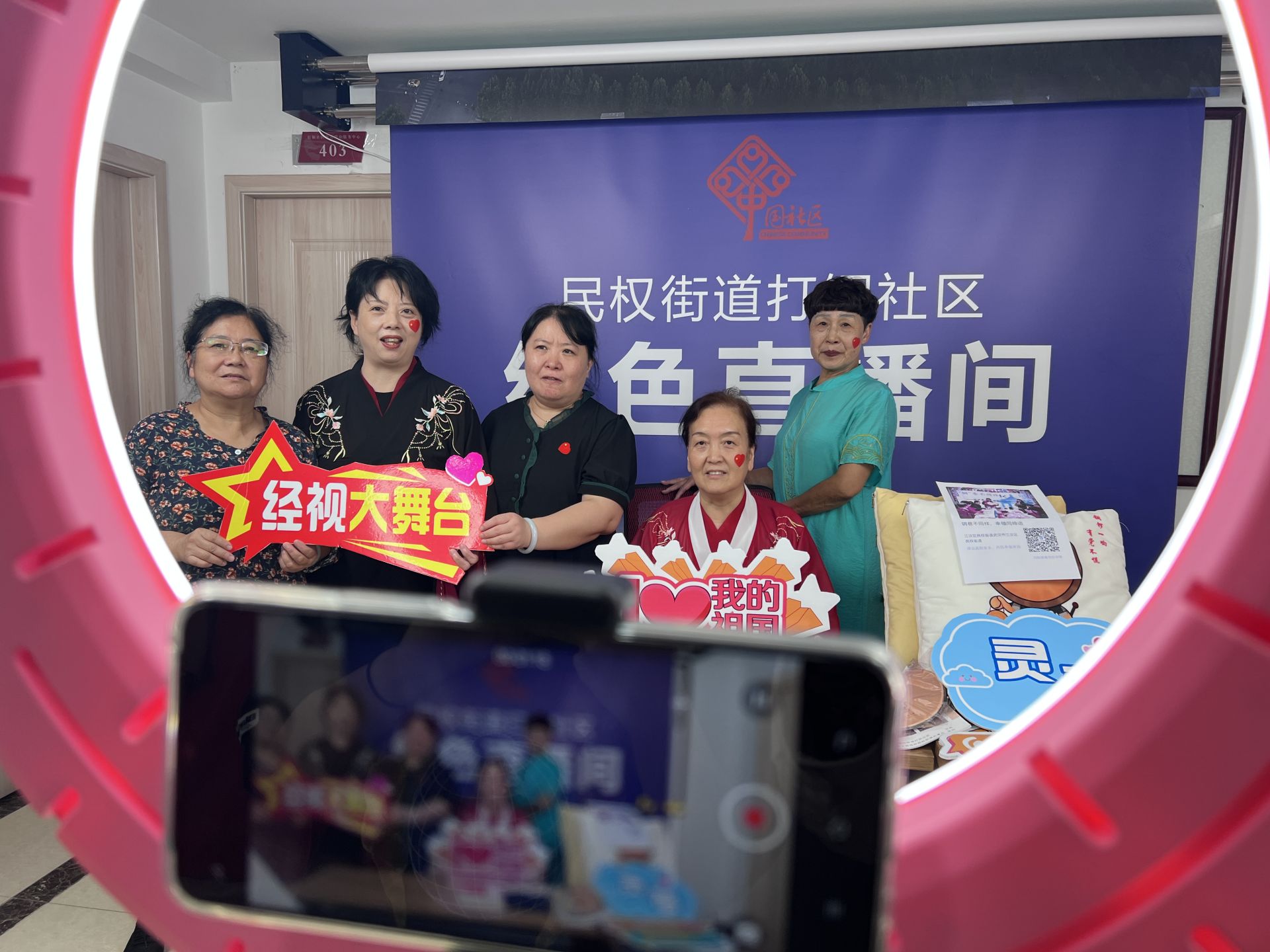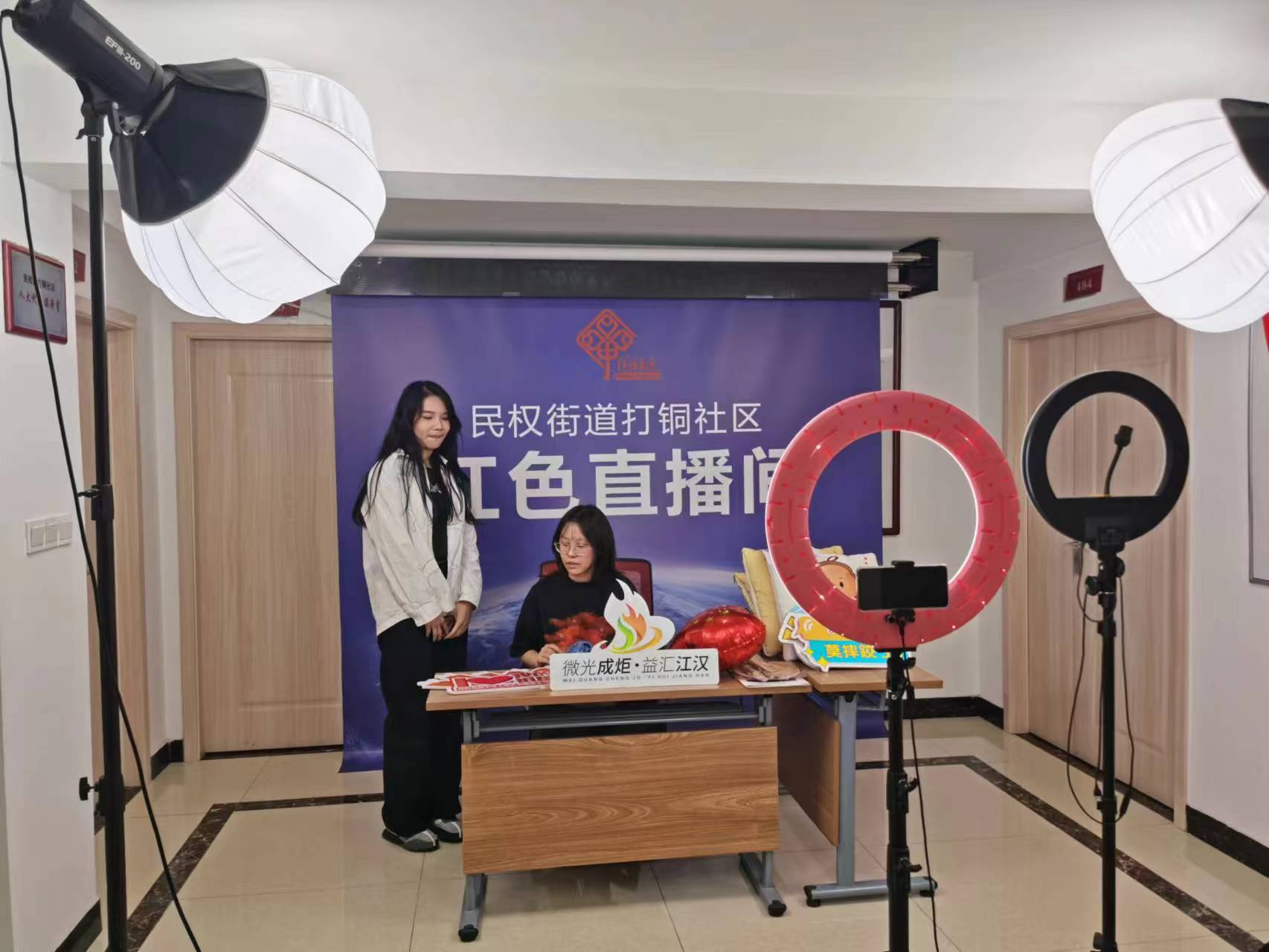 四楼的活动更为独特——华中师范大学新闻学院的同学在此进行红色直播间“真直播”活动。他们指导着想尝试做“网红主播”的居民朋友们坐上直播间“C位”打卡记录,展现出新时代社区居民的风采。