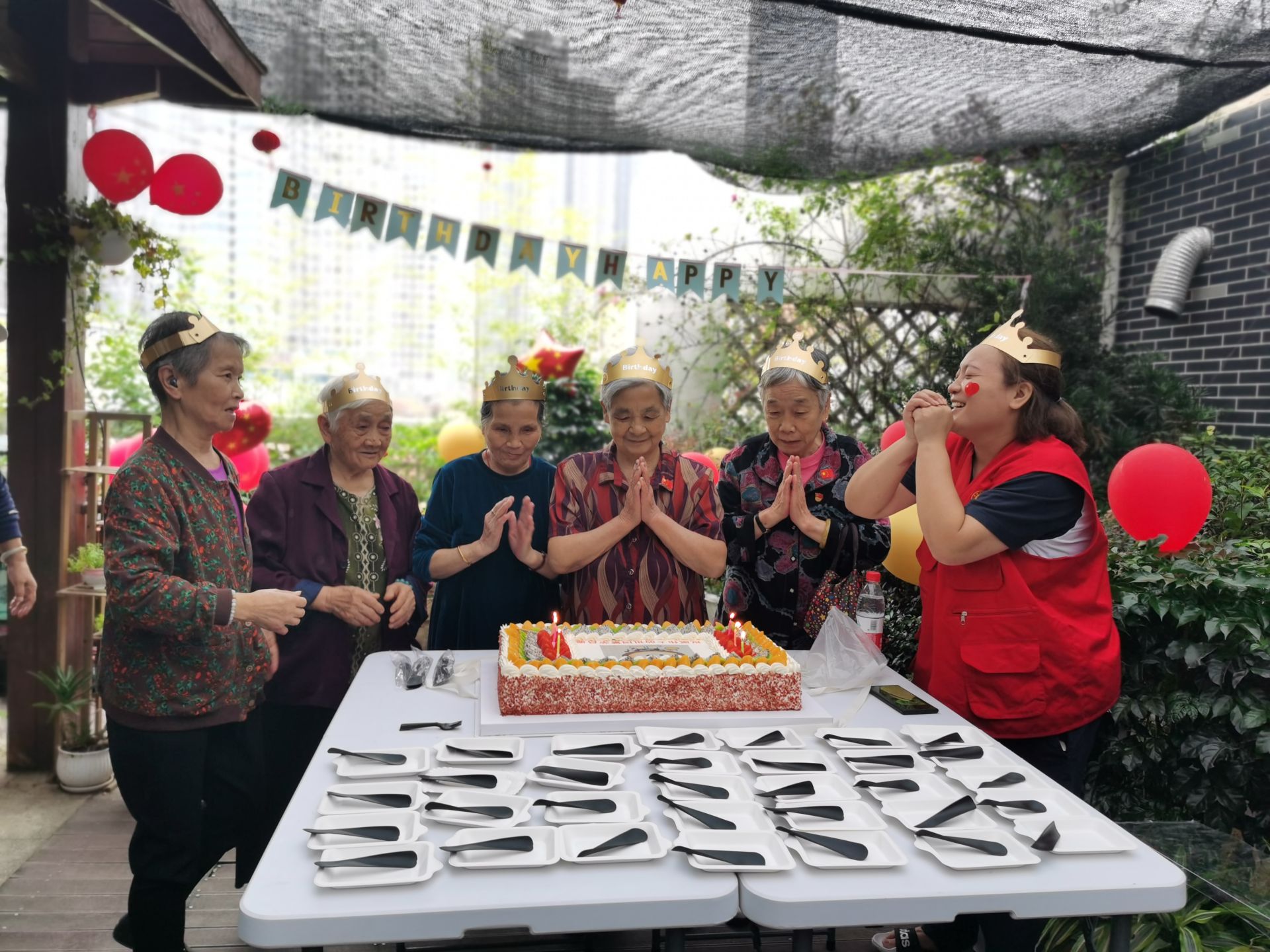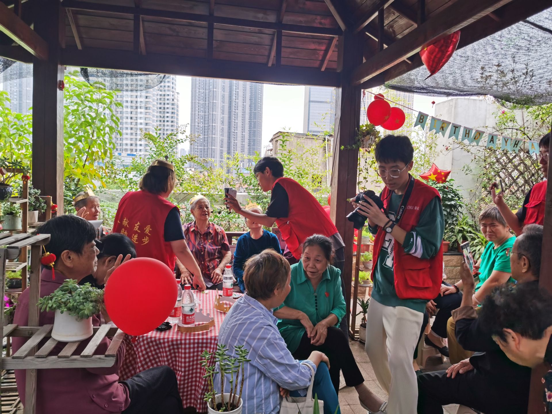社区五楼爱心厨房为大家特别开放了美食赏味体验。专业老师手把手指导居民们制作冰皮月饼,让大家感受到了浓浓的中秋节气氛。而空中花园则变身为“百人生日宴”的主会场。活动现场,志愿者们忙碌地穿梭在人群中,为老人们提供贴心的服务,彩色气球、定制蛋糕、生日歌......大家沉浸在喜庆氛围中,老人们相互邀请,笑语盈盈。“我今年84岁了,第一次在空中花园中和这么多人一起过生日,感谢社区的邀请,今天这个时刻是我晚年生活中的难忘回忆。”社区居民彭奶奶说道。