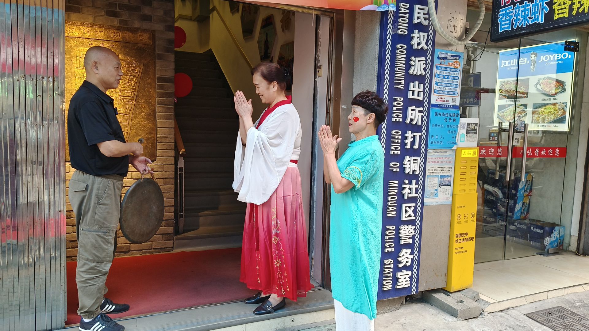 社区一楼热闹非凡,居民们在社区的邀请下,共同喊出“铜锣声声,遥遥领先”的口号,感受打铜社区铜锣文化的魅力。大家在公益集市中挑选着精美的汉服服饰,换上了新装,合影定格美好瞬间。