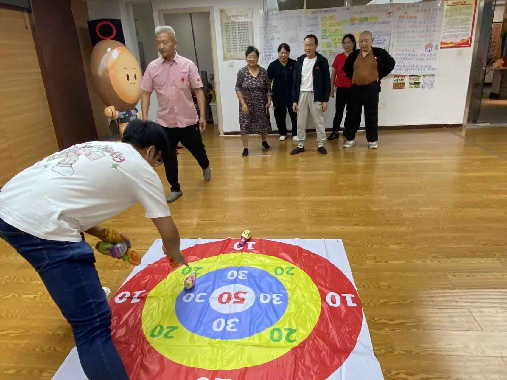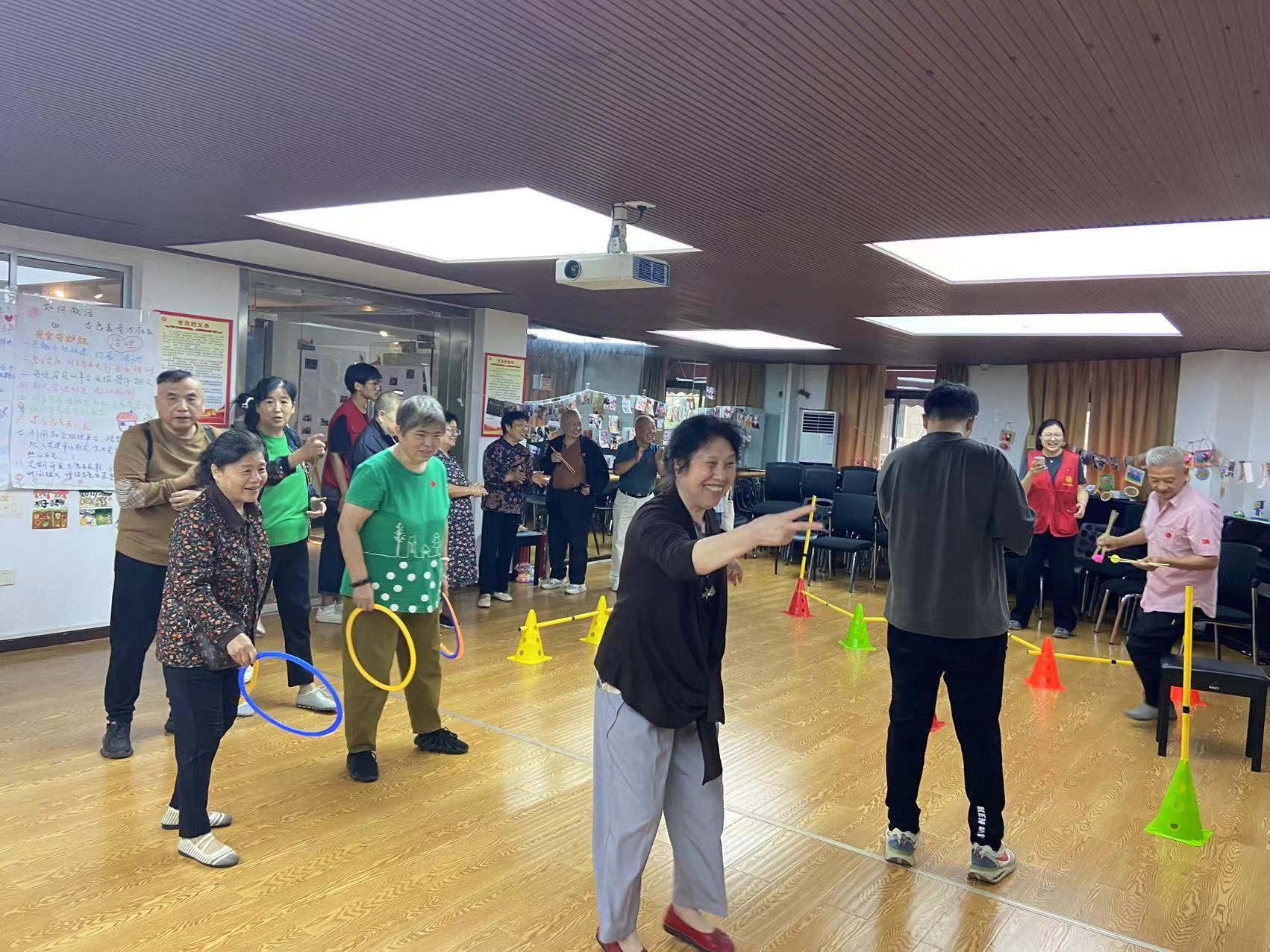 三楼桂香编织社的成员与居民们一起挑选手工材料,制作出美丽的手工制品。这些作品不仅在线上展示,还可以在一楼进行义卖,为公益事业贡献力量。此外,多功能室内设置了投壶、套圈等多种中国传统游戏,按照年龄分为儿童组和成人组,大家同台竞技,其乐融融。