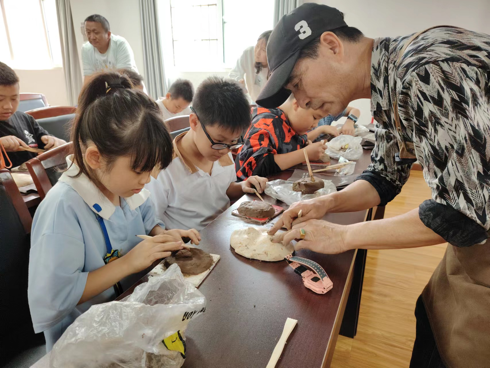 本次活动特别邀请武汉泥塑传承人胡作林老师到社区现场教学。胡老师为孩子们介绍泥塑的历史,详细讲解泥塑的工具、创作方法,并现场展示了自己创作的泥塑作品。家长和孩子们啧啧称赞:“我以为是一个老师坐在讲台上呢,原来是泥塑。”