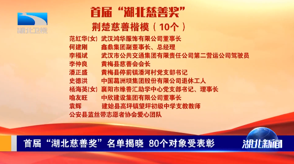 首届“湖北慈善奖”共分为荆楚慈善楷模10名,武汉市公交集团第二营运公司驾驶员李福斌、黄梅县停前镇潘河村党支部书记潘正盛等9名个人和荆州公安县蓝丝带志愿者协会爱心团队获得此项荣誉,“幸福家园”村社互助项目““湖北希望工程 知音同行”“思源百万助学”等10个项目获优秀慈善项目和慈善信托奖、湖北省慈善总会、十堰市慈善总会等10家单位获优秀慈善组织,爱心捐赠企业和个人共50名。