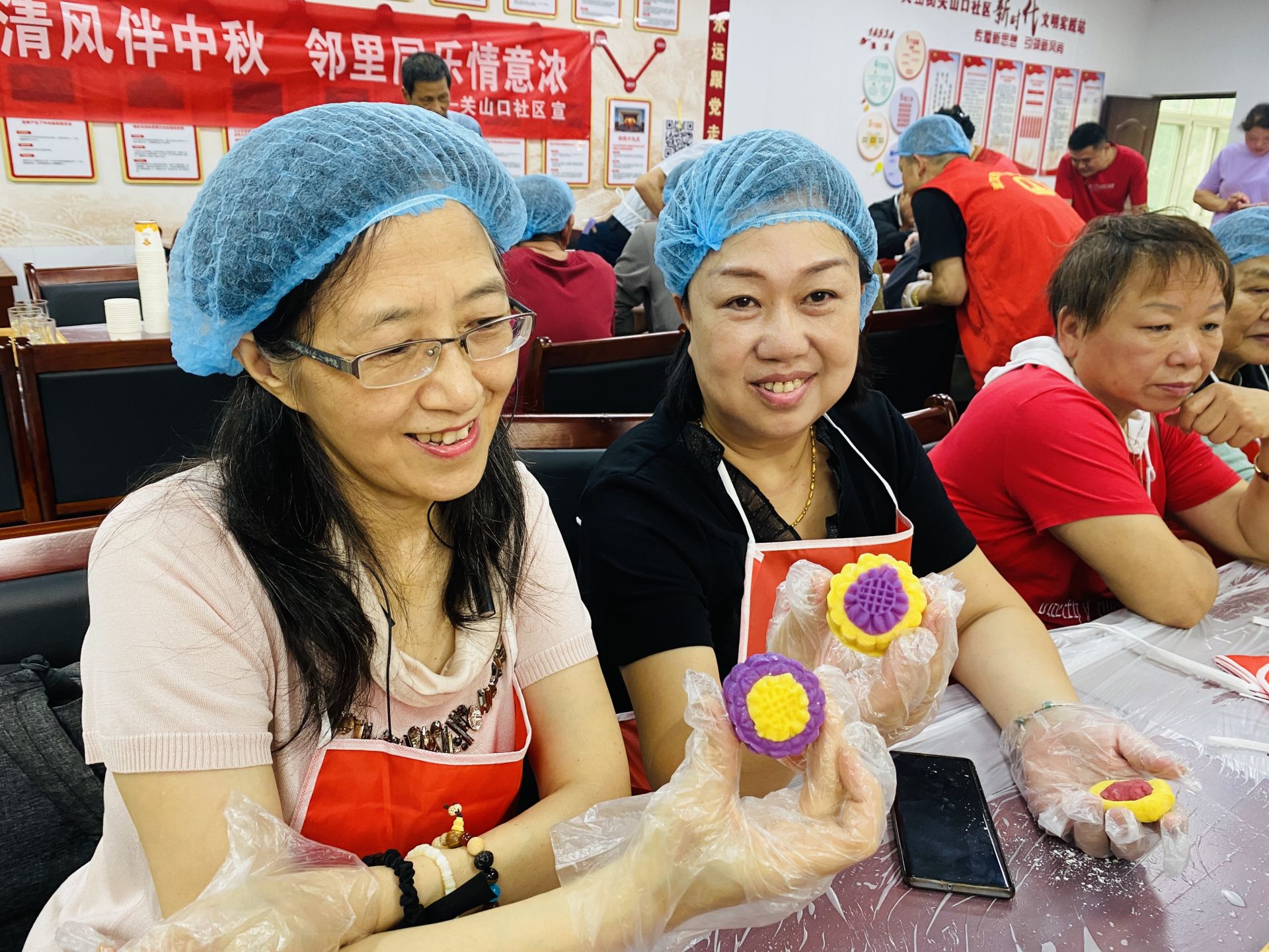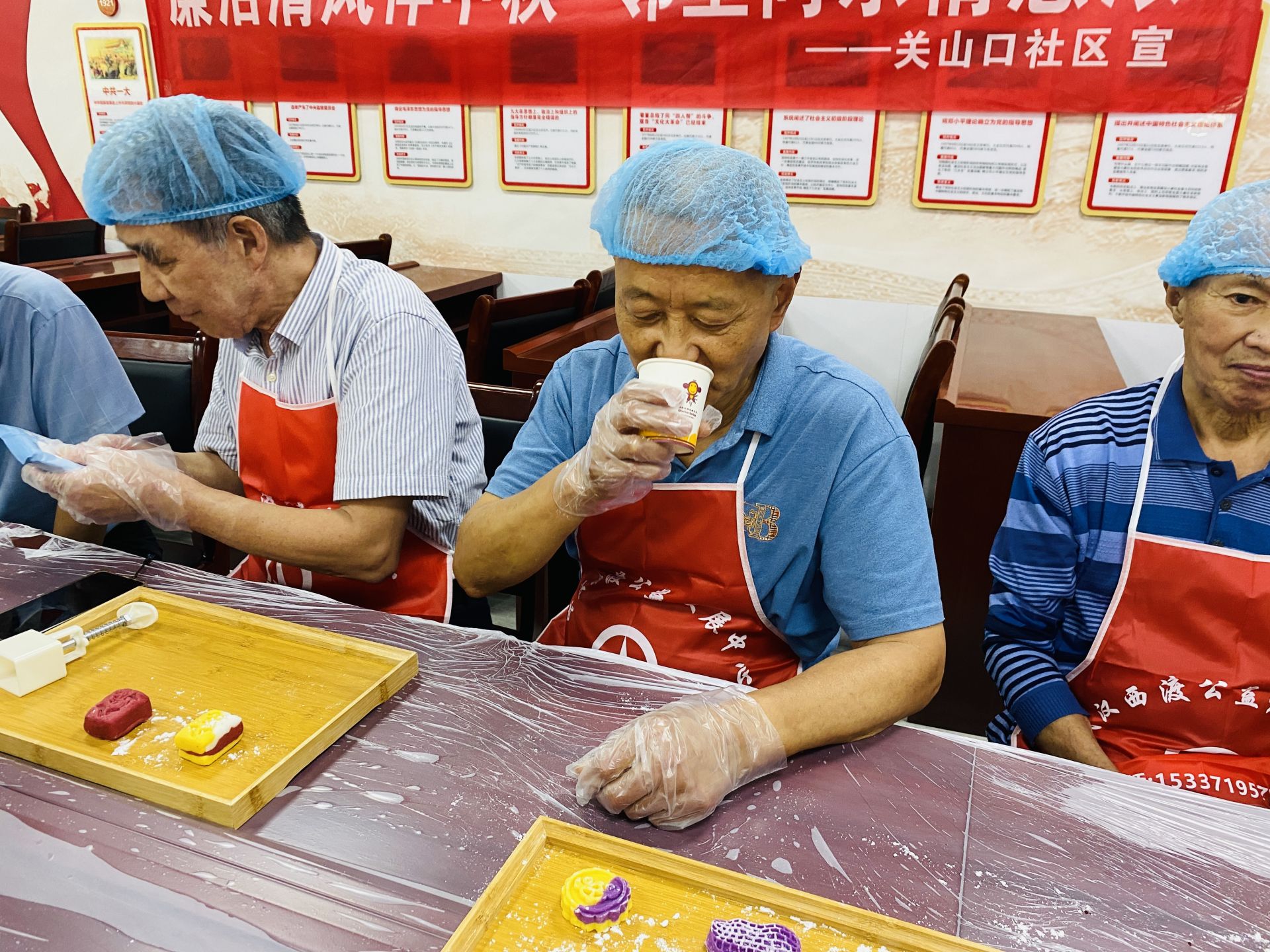 座谈会后,社区工作人员拿出提前准备好的面粉、馅料、模具等,邀请居民们一同制作冰皮月饼。大家上阵齐动手,忙的不亦乐乎。