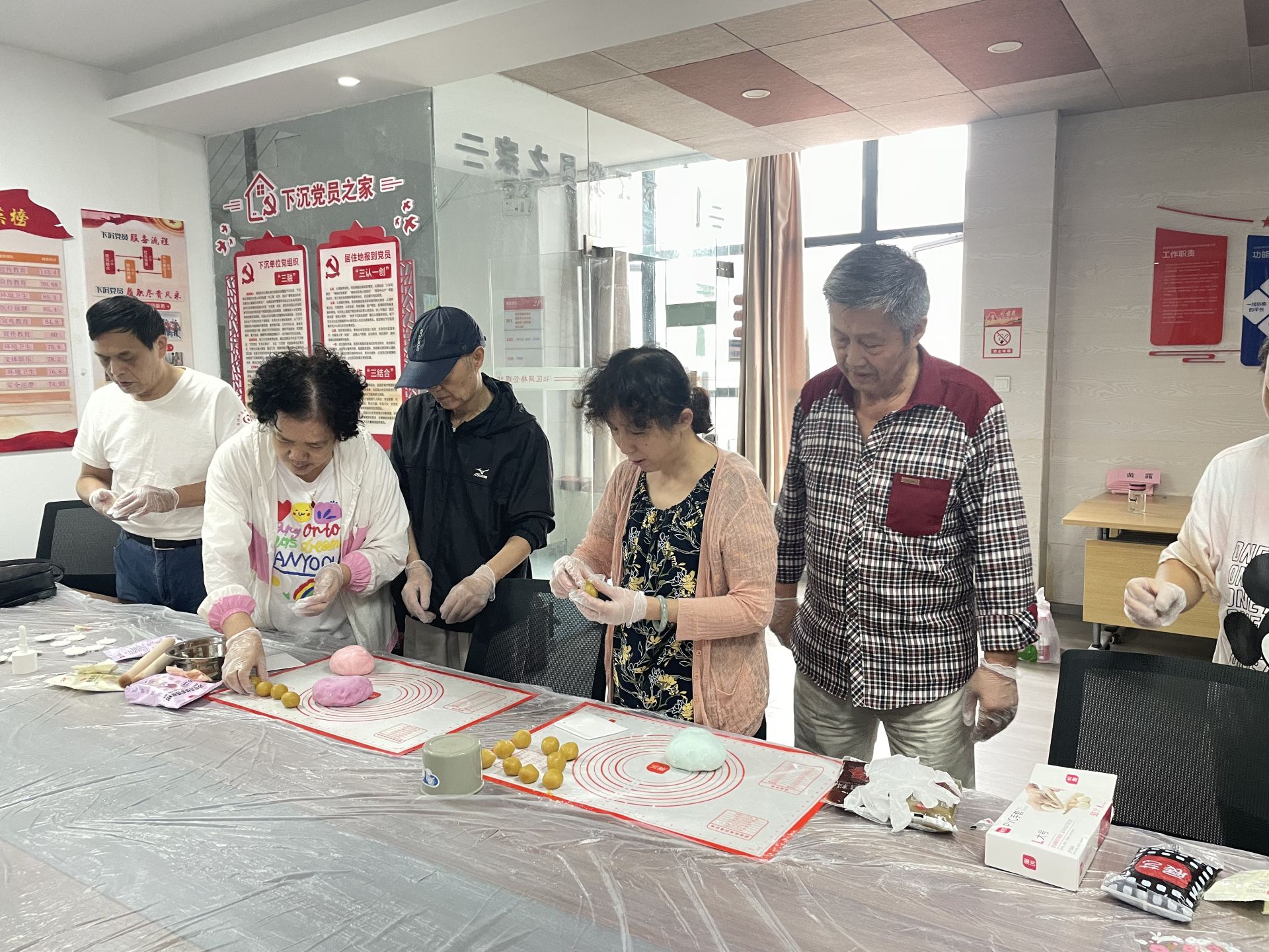 月饼古时已有“团圆”的象征意义,中秋吃月饼的习俗延续至今。在月饼制作环节,工作人员向大家介绍了制作所需的各类材料、工具以及月饼的制作步骤。居民们踊跃参与,纷纷动手制作。大家分工明确,有的和面、有的搓面团、有的搓馅料、有的压模印,有条不紊的进行各项工序。现场氛围热烈,居民们情绪高涨,展示出浓厚的节日氛围。