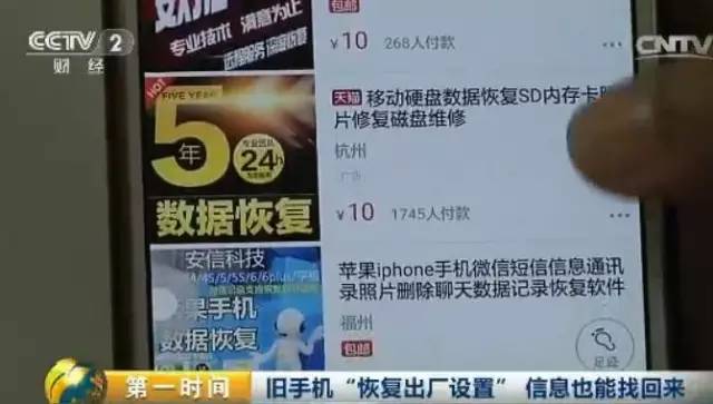 一些机主会在卖旧手机之前,把里面的信息删除掉。但即便是这样,也不见得一定安全。记者在淘宝网上搜索“手机数据恢复软件”,一下就弹出了上百条信息,广告页面宣称照片、联系人、视频、短信等都能找回,而且价格非常便宜。