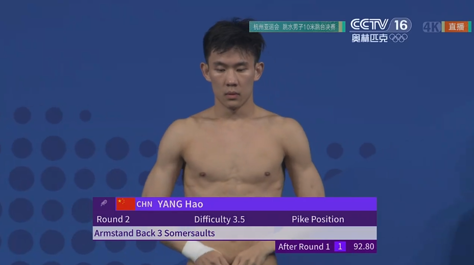 10月4日,杭州第19届亚运会跳水男子10米台决赛,中国选手杨昊夺得金牌。中国跳水队包揽杭州亚运会跳水项目全部10枚金牌。
