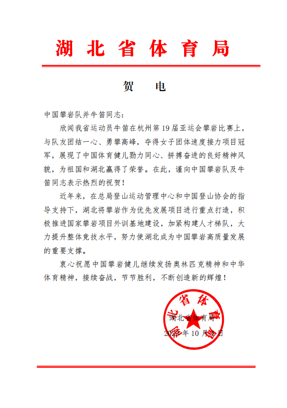 赛后,湖北省体育局发来贺电,向中国攀岩队及牛笛同志表示热烈的祝贺!