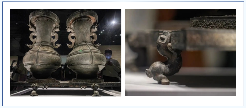 陈列于湖北省博物馆曾侯乙展厅的铜联禁大壶,是湖北新晋网红文物。这件铜联禁大壶是一件酒器,双壶放置于铜禁上。禁的长边由四只小兽支撑,小兽的口和前足衔托着禁面,后足蹬地,腰身呈优美曲线。“其形象小巧玲珑,与体积大的禁面和铜壶形成了强烈对比。”