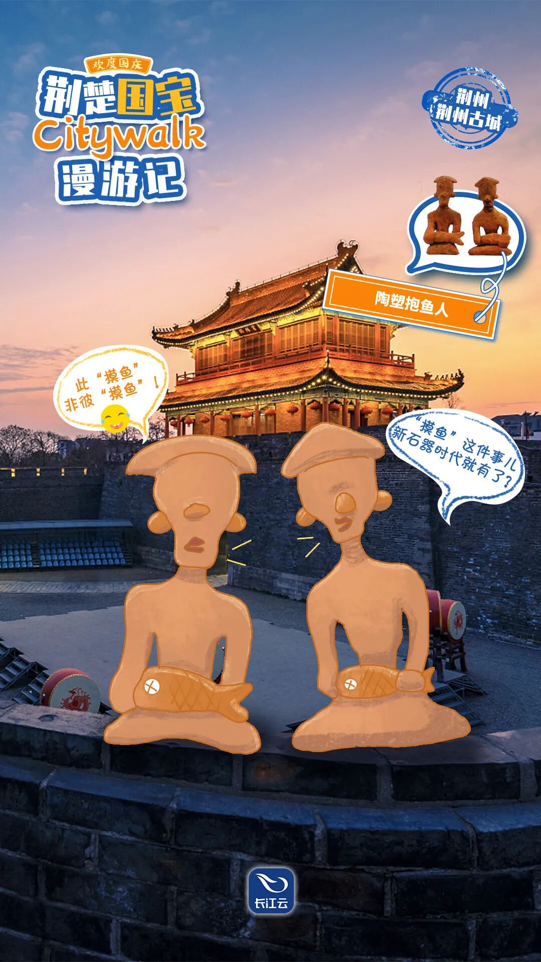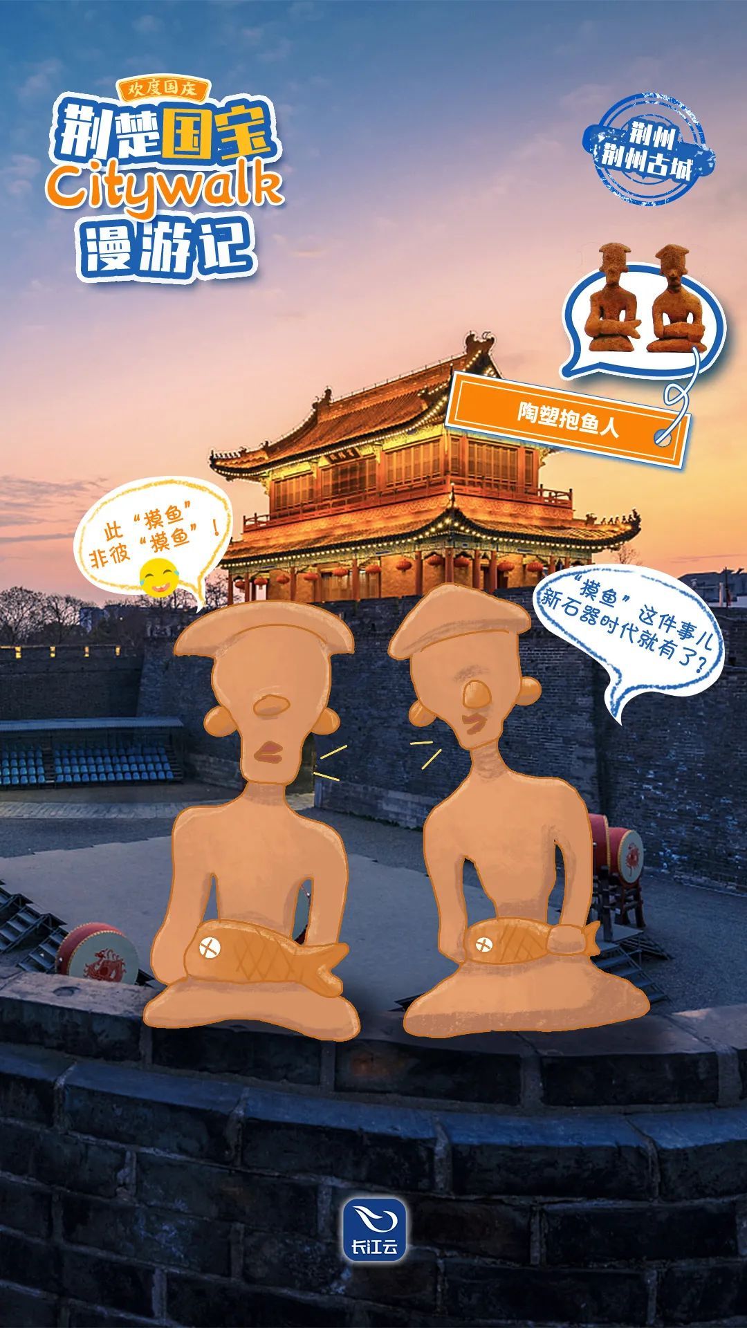 8天假期,《荆楚国宝Citywalk漫游记》精彩不断,陪您欢度国庆。趣味文物欢乐多,这何尝不是“国家宝藏”的另一种打开方式?跟着“陶塑抱鱼人”打卡各地博物馆,感受诗意流淌的长江文明、奇谲浪漫的荆楚文化吧。