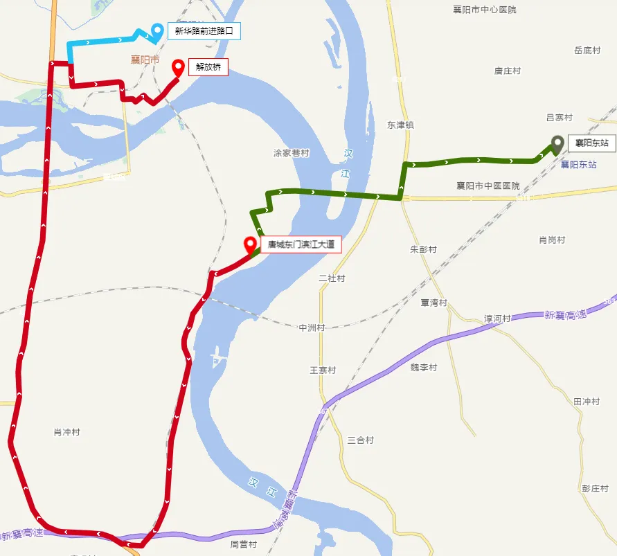 半马襄阳东站方向摆渡路线10:35开始运行:唐城东门滨江大道(起点)--(左转)凤雏大道--(右转)杨家河路--(左转)鱼梁坪大道--(右转)环城南路--东津大桥--南山路--(右转)荆山路--襄阳东站(调头靠停后返回起点,循环摆渡)。