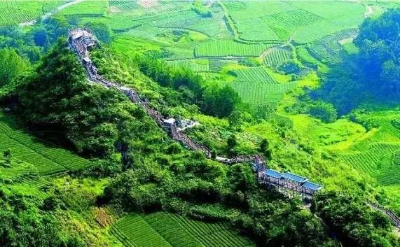 一条长1000余米、供游客登山休闲、观赏有机茶园的木质栈道架设在湖北省恩施土家族苗族自治州宣恩县伍家台村茶园间的山头上。陡峭山脊上蜿蜒的栈道,远远望去似浓缩版、木质化的"长城"。