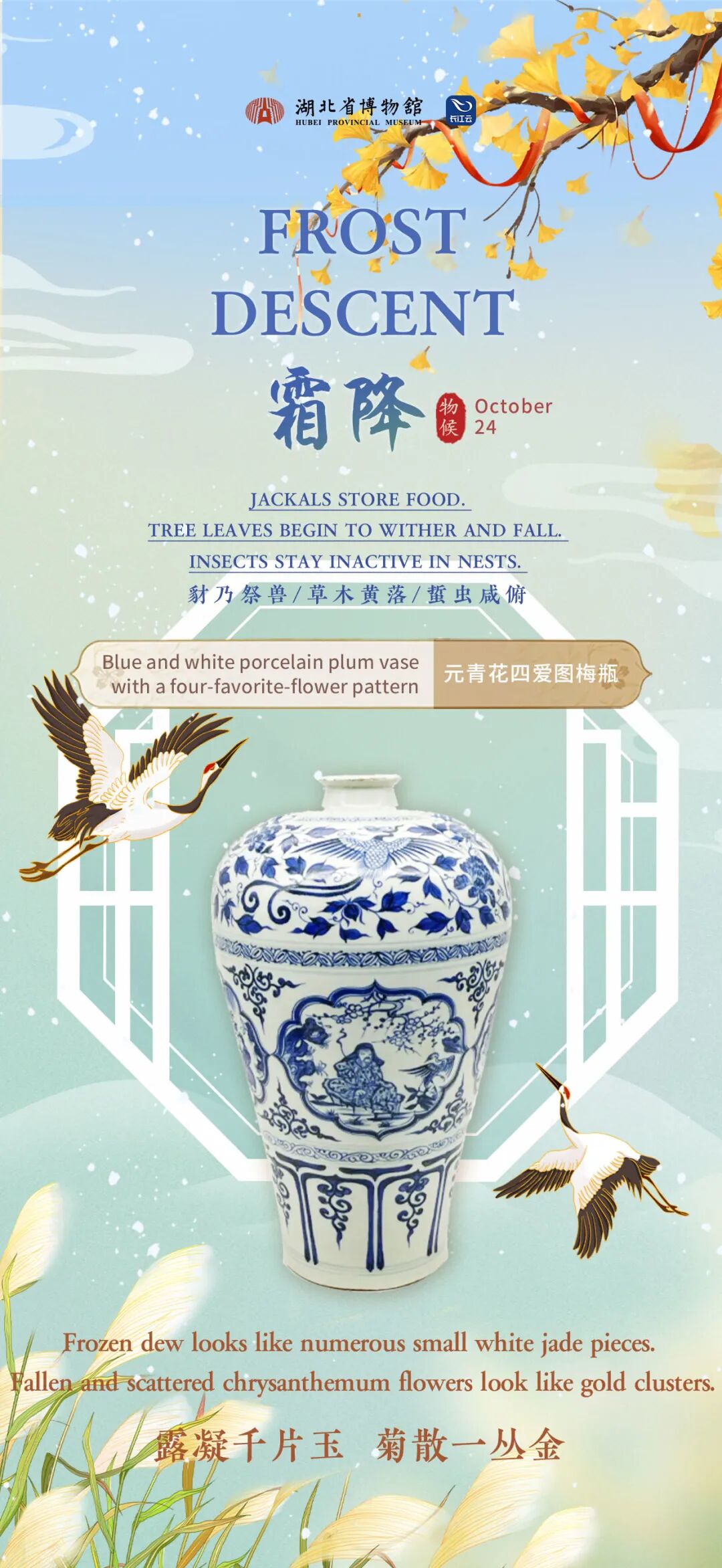 “满园花菊郁金黄,中有孤丛色似霜。”霜降,是深秋的华丽谢幕,红枫黄栌、桂菊飘香,变幻出如火如锦的画卷。眼前成熟丰美、浓墨重彩的时节,正是万物萧瑟前最后一次的用力绽放。今日分享湖北省博物馆馆藏——元青花四爱图梅瓶,腹部四个菱形的开光内描绘了四个人物故事,其中“陶渊明爱菊”十分契合霜降时节赏菊的主题。“采菊东篱下,悠然见南山”,随着最后一片落叶归根,最后一枚硕果收获,一季到此终结,一切过往都在此时沉淀、结果、收获。