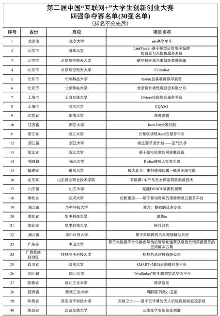 记者发现大赛入围金奖的30个项目中,除了清华、北大等高等院校外,还有职业院校。这表明了此次大赛是一个不问出身,只看成绩的创业比赛。评委马德富说,今年大赛的项目水平之高,让他十分震撼。他认为今年每个小组的前几名和去年金奖、银奖水平相差无几。“互联网+”创业大赛完全激发了学生的潜能,相比以前的大学都是老师站在台上讲,学生坐在下面记。而本次大赛则变为评委们坐在下面记笔记,学生在台上滔滔不绝的演讲。每个项目、每个学生的发言都让评委感受到创新创业教育对于激发90后、推动“互联网+”的意义。