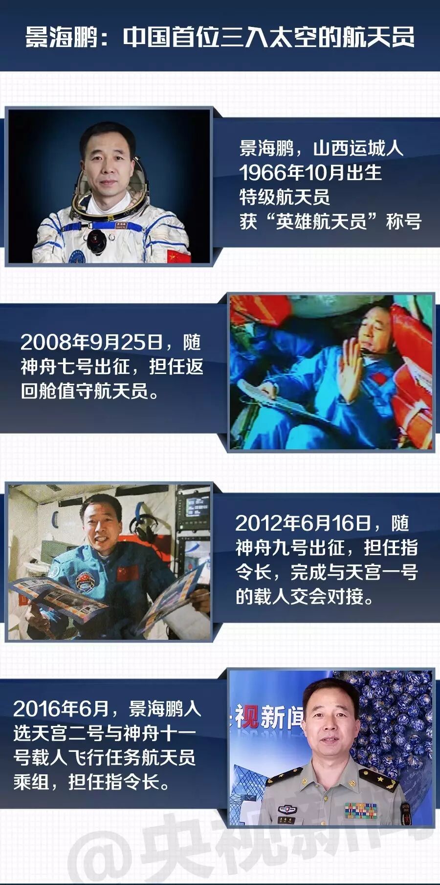 航天员景海鹏相信大家不会陌生,他曾经执行过神舟七号和神舟九号载人飞行任务,此次入选神舟十一号飞行乘组,是他第三次太空飞行,也是我国唯一一位三次进入太空的航天员。