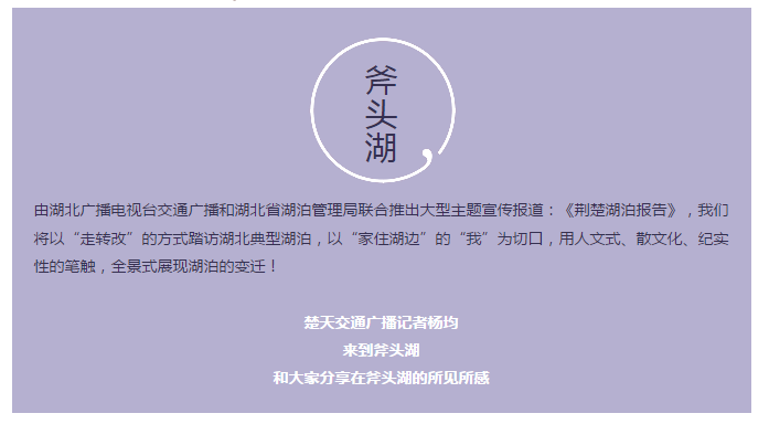 由湖北广播电视台交通广播和湖北省湖泊管理局联合推出大型主题宣传报道:《荆楚湖泊报告》,我们将以“走转改”的方式踏访湖北典型湖泊,以“家住湖边”的“我”为切口,用人文式、散文化、纪实性的笔触,全景式展现湖泊的变迁!