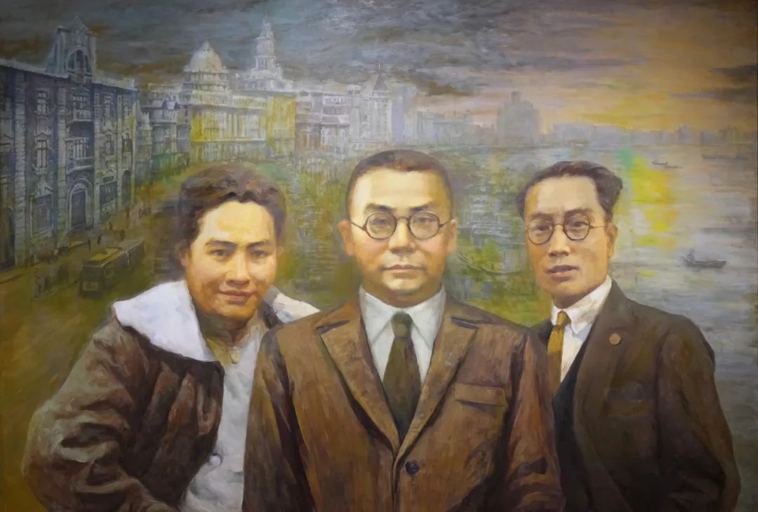 “龙潭三杰”油画,从左至右分别为胡底、李克农、钱壮飞。