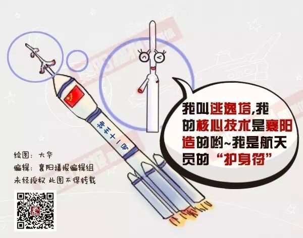 逃逸塔高8米,它的任务是在火箭起飞前15分钟到起飞后160秒时间段内,万一发生故障,火箭顶端的几个小火箭推进器可以拽着整流罩里的轨道舱和返回舱与火箭迅速分离,并安全降落回地面,帮助飞船上的航天员脱险。因此,在整个发射过程中逃逸塔的重要作用,不言而喻。