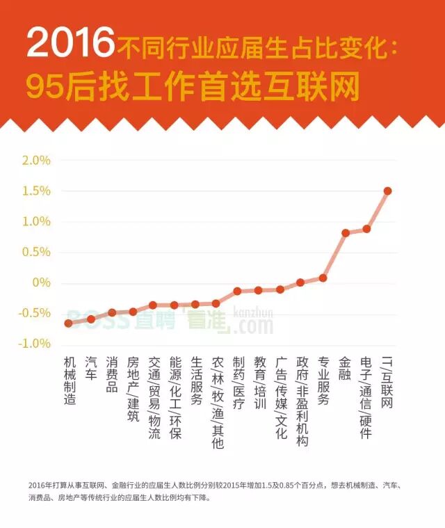 各行业薪资差异化明显使得更多应届生向互联网、金融等高薪朝阳产业涌入,其中互联网成为95后应届生就业的首选行业。而进入机械制造、汽车、消费品、房地产等传统行业的毕业生人数呈现不同程度的下降,从侧面体现出实体行业萎靡对大学生就业产生的影响。