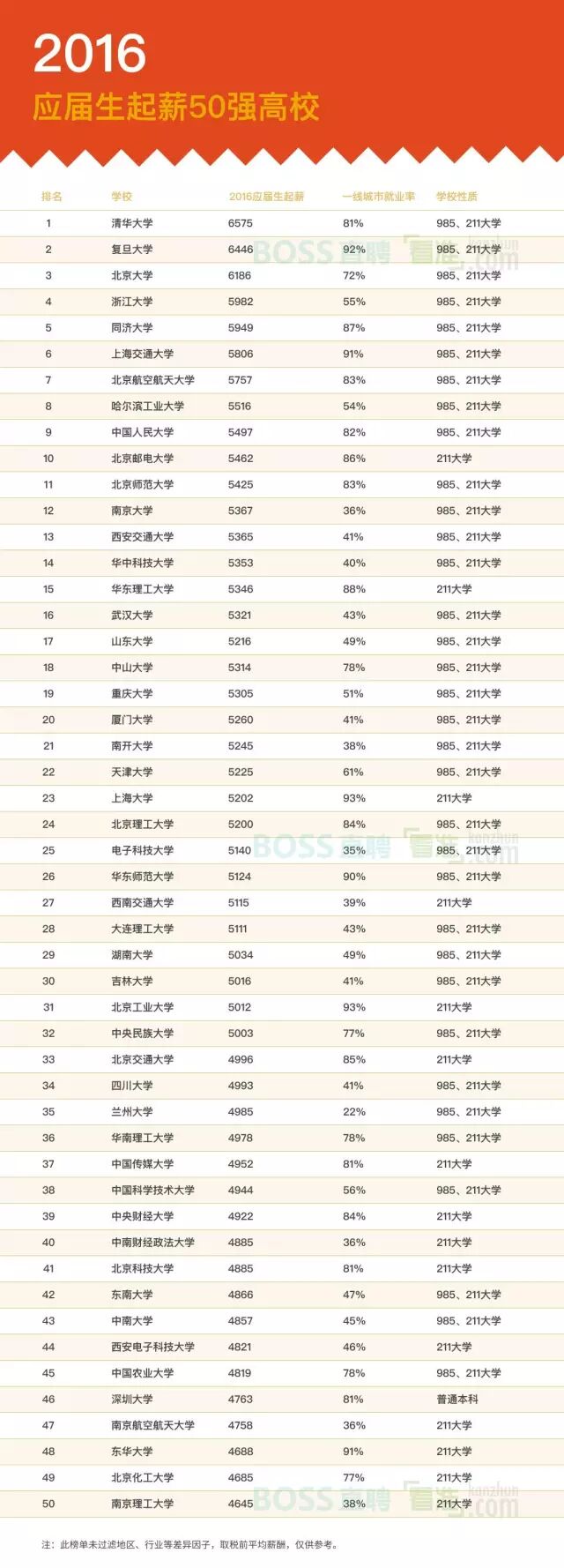 从2016年应届生起薪50强高校来看,基本和就业竞争力前50高校保持一致,而且基本都集中在北京、上海、江苏等东部发达地区,中西部地区高校很少。下面是2016年起薪50强高校: