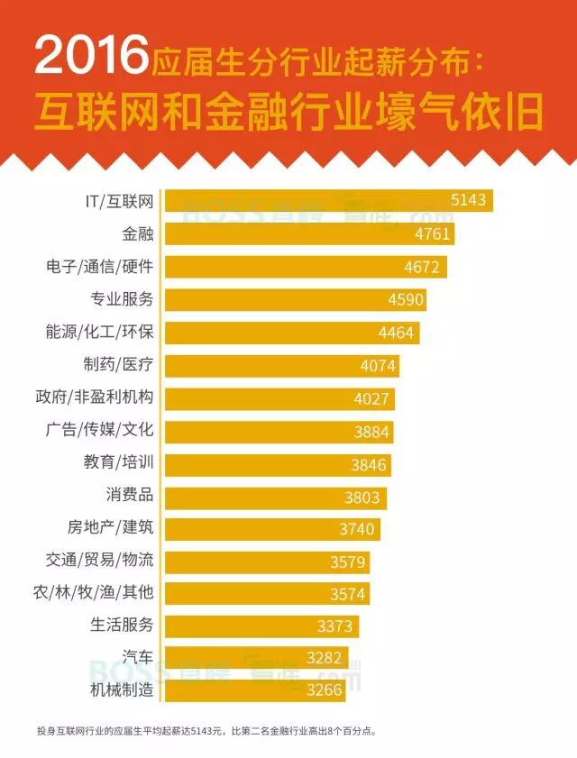 虽然互联网行业遭遇资本寒冬,不过在双创大潮推动下,2016年应届生平均薪酬最高的还是从事互联网行业的,达到5143元。应届生起薪较高的行业还包括金融、电子/信息/硬件、专业服务等,都超过了4500元。而处于重新洗牌阶段的广告传媒行业应届生平均起薪仅为3884元,低于整体均值。起薪较低的行业包括农林牧渔、生活服务、汽车和机械制造等,基本接近3000元。