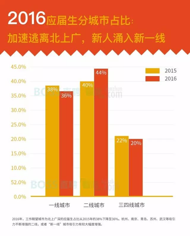 数据表明,2016年工作期望城市中,北上广深的应届生数量在继续下降,36%的毕业生希望留在一线城市,而在三年前,这个数字超过50%。这可能是由于一线城市持续增加的生活压力以及人口数量控制的收紧政策,加之“新一线城市”如杭州、南京、青岛、成都等地的崛起,导致应届生们更多选择新一线城市就业。