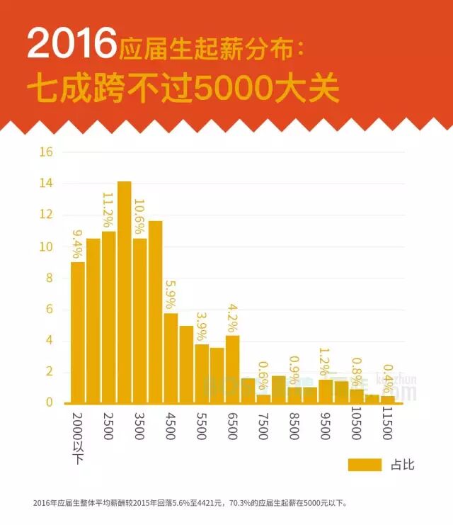 从2016年应届生起薪分布来看,2016年全国应届生平均期望薪酬较去年回落5.6%,至4421元。理想很丰满,现实很骨感,企业为应届生开出的平均薪酬为3958元,远低于期望薪资。