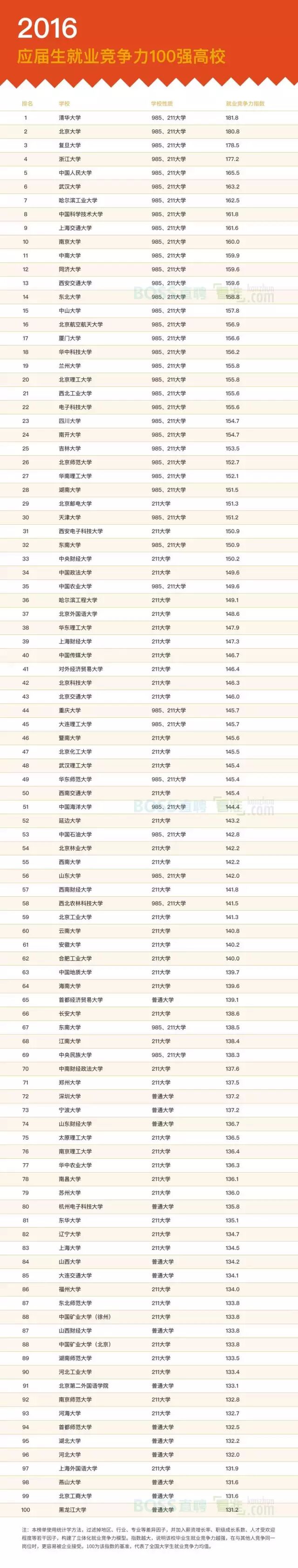 从学校类型上看,TOP 50中,44%大学为理工类,38%大学为综合类,文史类仅占到18%。对于普通高校学生来说,提高软实力成为求职的必然选择。下面是2016年应届生就业竞争力100强高校:
