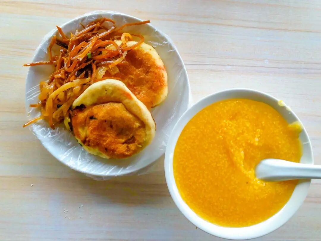 玉米粥,南漳话叫“苞谷糊豆”。对于很多南漳人来说,它不仅是一种早餐,更是一种记忆和情怀。在以粗粮为主的年代,苞谷糊豆是农家人的重要主食之一。自家秋收的玉米磨成苞谷糁,倒入装水的锅中,一边煮一边搅拌,熬好的苞谷糊豆是粘稠状的,散发出诱人的香气。如今,苞谷糊豆+水煎包已变成南漳常见的早餐搭配之一,一口糊豆,一口金黄诱人的水煎包,再配点咸菜或者其它自制腌菜,鲜香四溢。