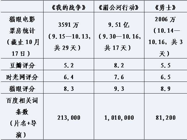 令人惋惜的是,“花开相似香不同”,它们三者并没能实现国产主旋律电影的“成功三连弹”,彼此间差距十分明显(见下表):