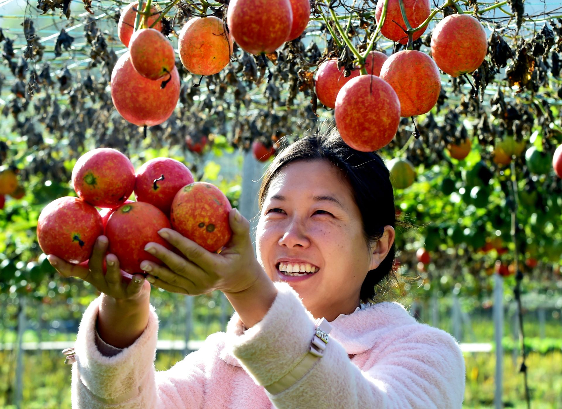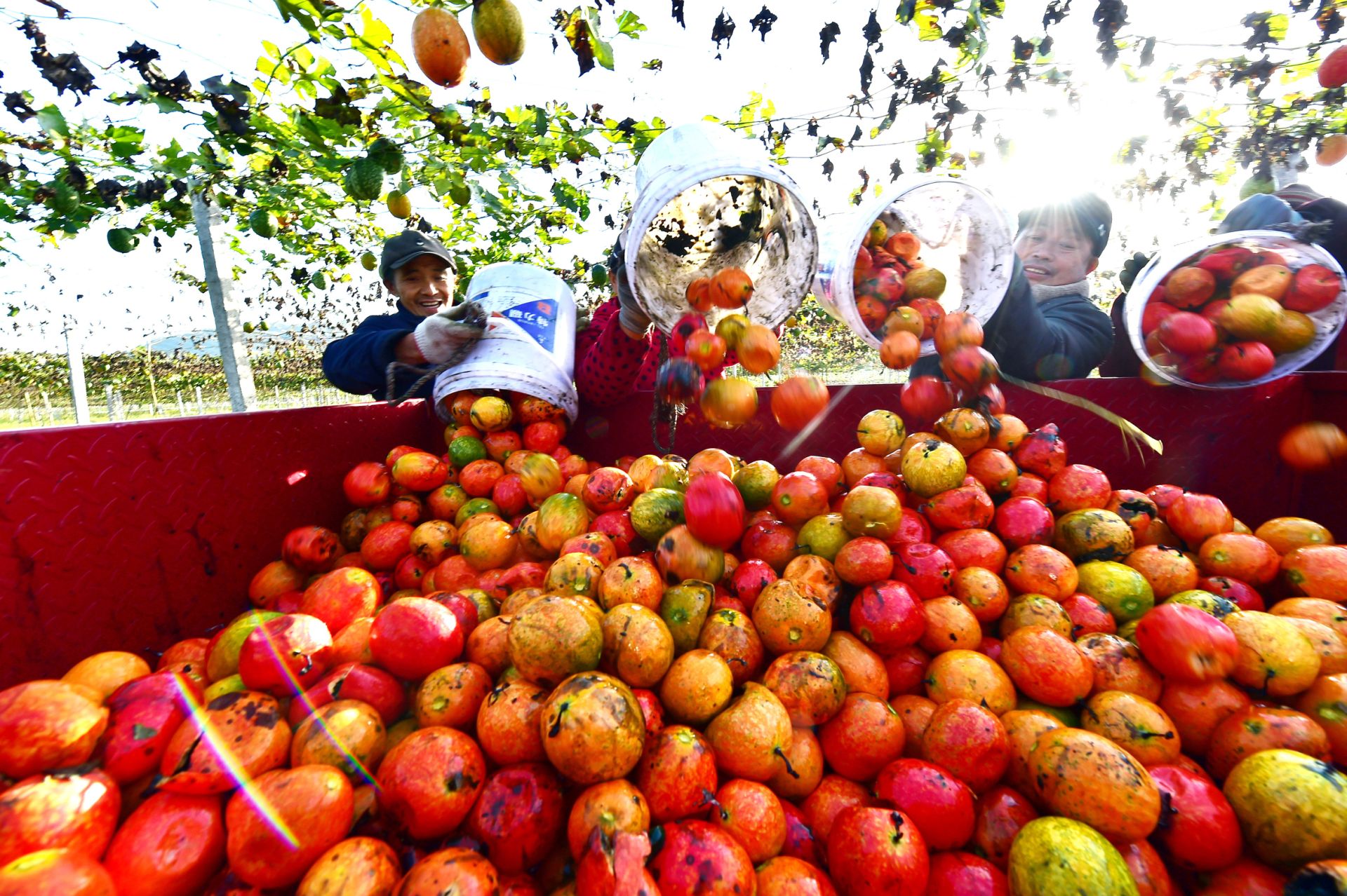 初冬至,收获时。湖北省襄阳市南漳县武安镇木林包村的130亩吊瓜陆续成熟,藤蔓下密密麻麻悬挂着的吊瓜由“青”转“红”,村民们忙着采摘、搬运、装车,现场一派丰收的景象。