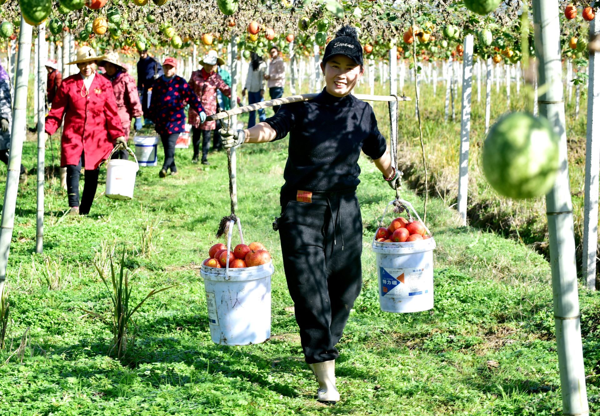 △吊瓜成熟,村民正在忙碌着抢收