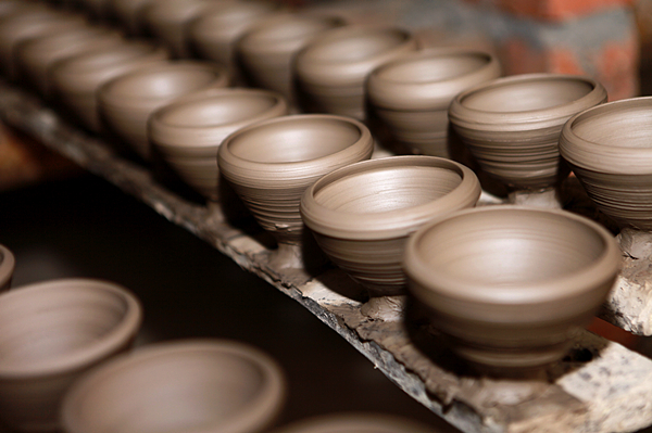 凉干后,一件件陶艺半成品经过打磨、补水、上釉,然后浴火重生。
