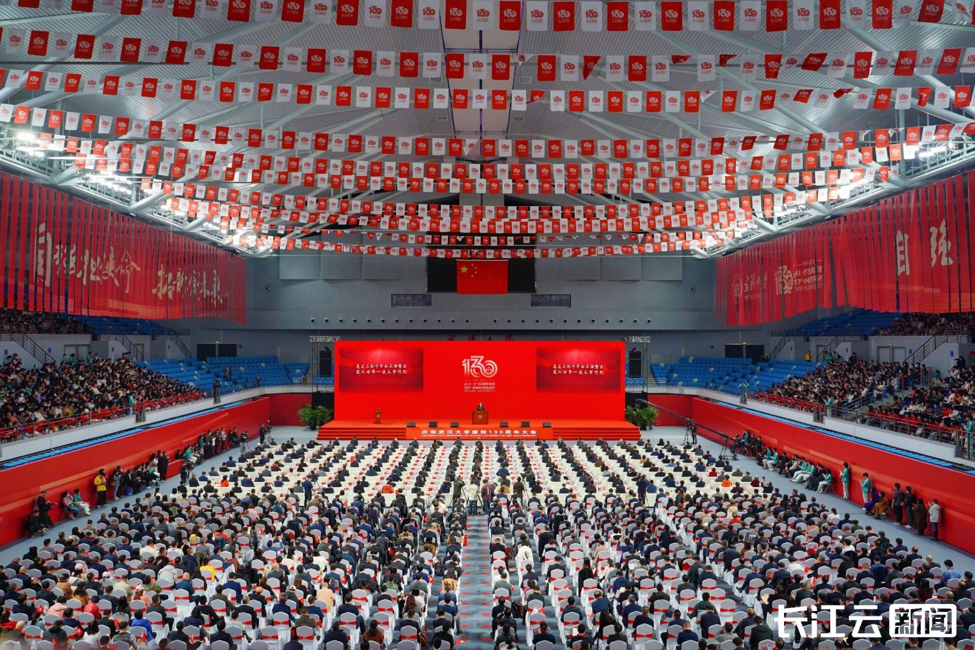 今日的武汉大学,层林尽染,水秀山明,鸾翔凤集。11月29日上午,武汉大学建校130周年大会在卓尔体育馆隆重举行。各级领导、各界嘉宾、国内外高校代表、海内外校友代表欢聚一堂,以“自强担使命,拓新创未来”为主题,共同庆祝武汉大学建校130周年。