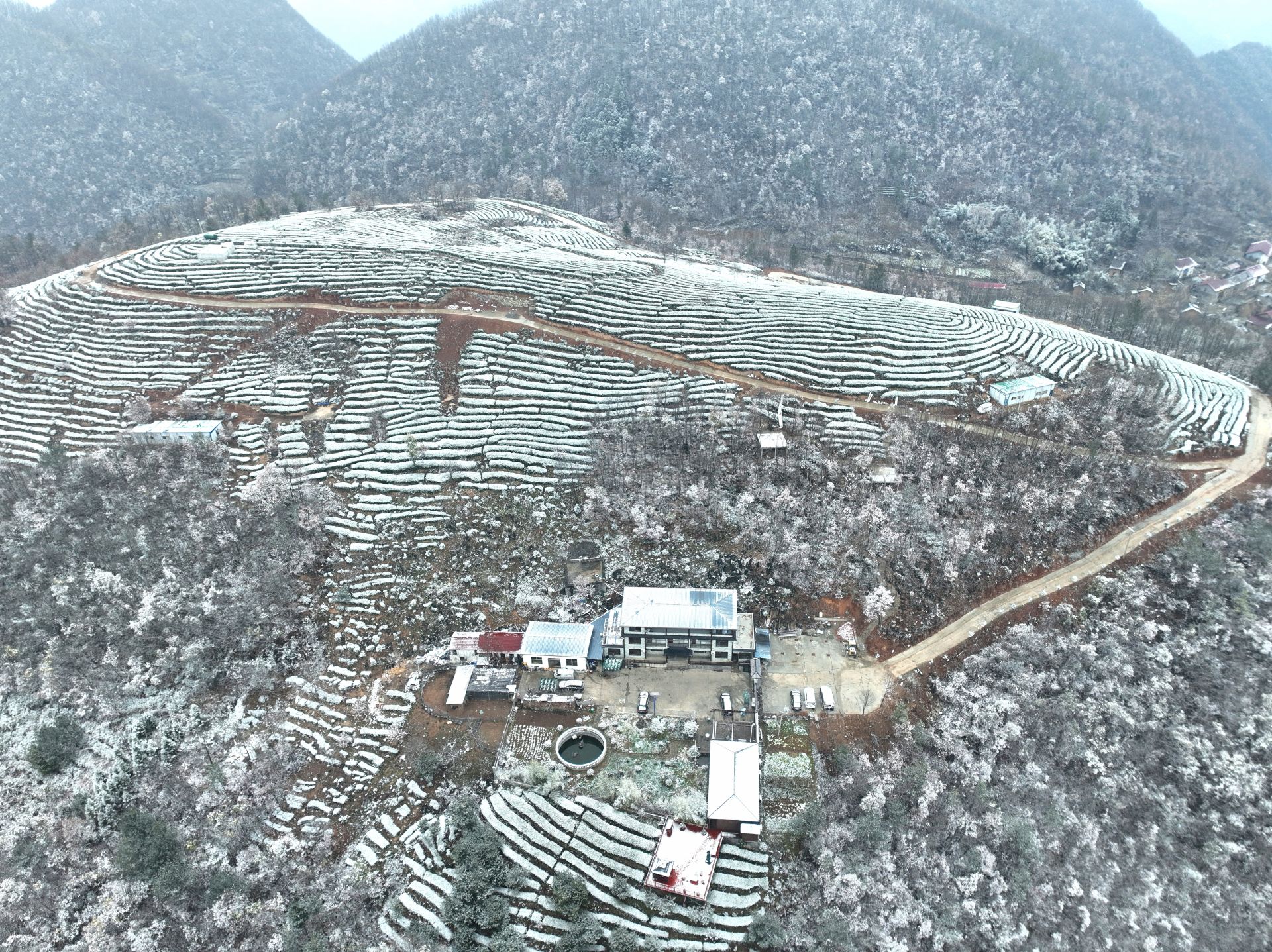 11月30日,湖北省南漳县板桥镇迎来了2023年冬天的第一场雪,突如其来的雪花染白了每一寸土地。