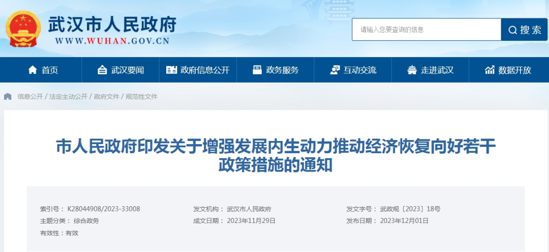 12月1日,武汉市人民政府印发《关于增强发展内生动力推动经济恢复向好若干政策措施的通知》,其中提出支持刚需和改善性住房需求、促进房地产投资、推动建筑业高质量发展等3项措施。