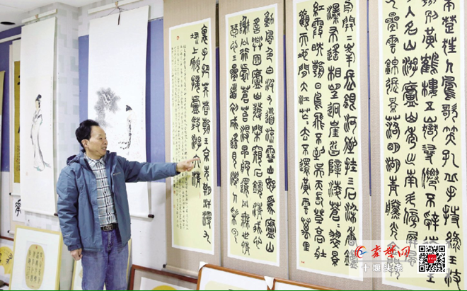 记者看到,吉昌盛还创作了众多书法长卷,有的长几十米。他善于结合热点,创作的书法作品很接地气。在“清风廉韵”2023年十堰市弘扬社会主义核心价值观暨老年廉洁文化书画摄影作品展上,他创作的篆书对联“观史知今当知进退读书明志可识春秋”,很受好评。