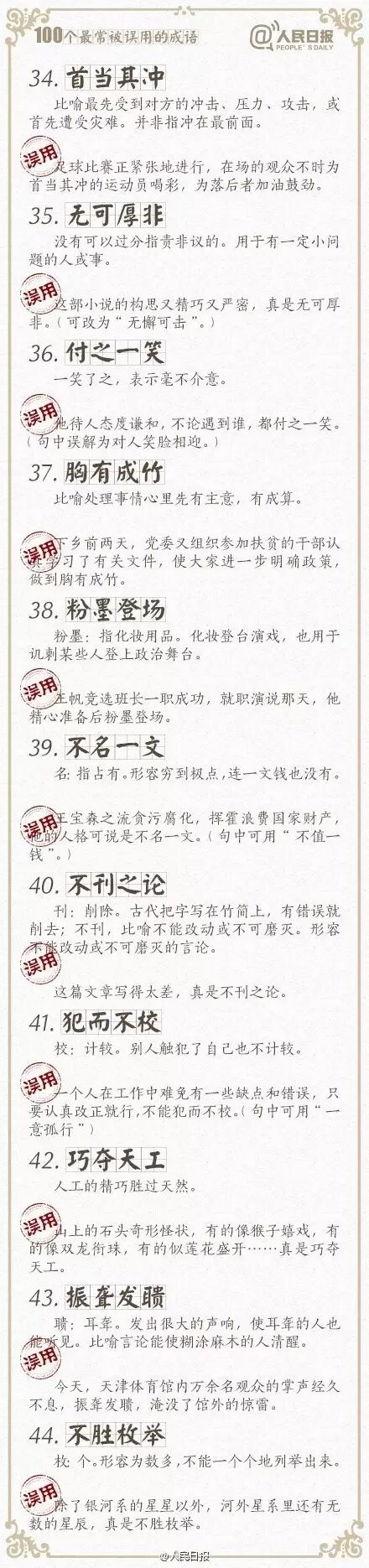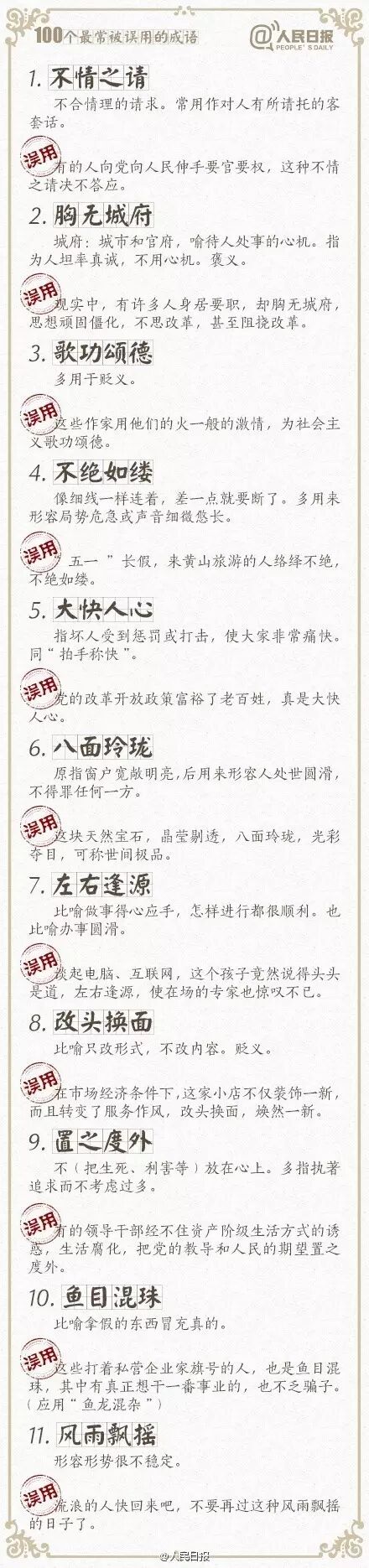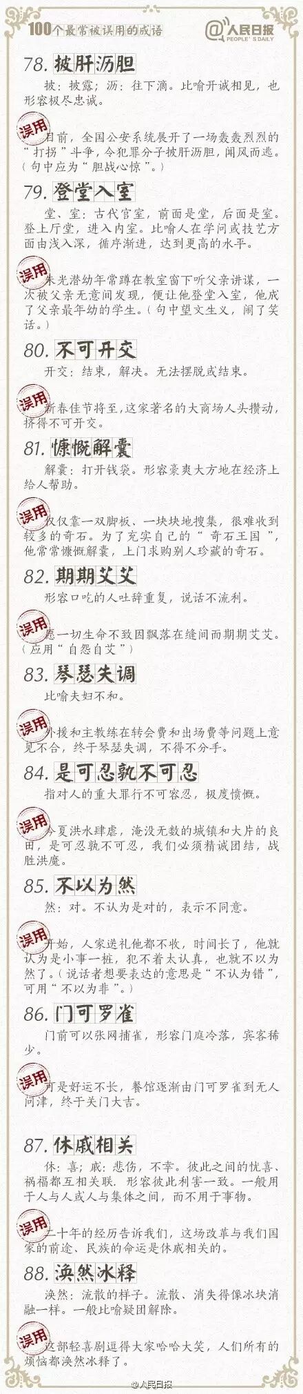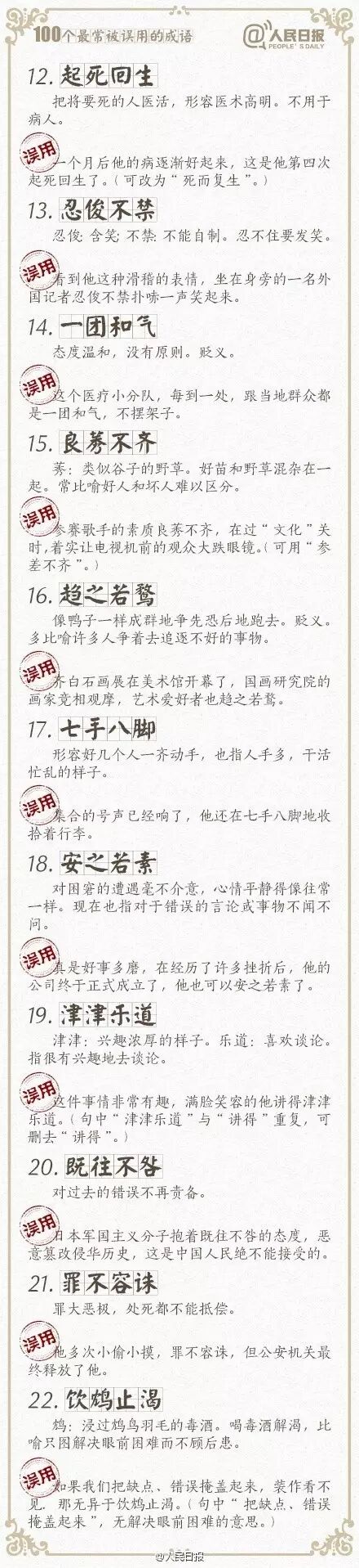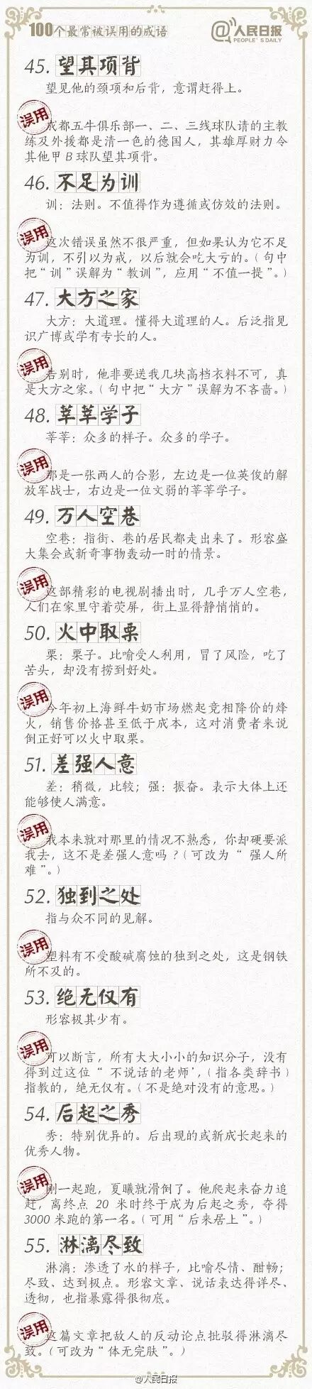①万人空巷:形容盛大集会或轰动一时的情景;②改头换面:比喻只改形式不改内容,贬义;③不情之请:不合情理的请求,常用作客套话;④差强人意:大体上还能够使人满意…工作生活中,成语被误用的情况不在少数。100个常被误用的成语,你用对了吗?快来一起学习吧!
