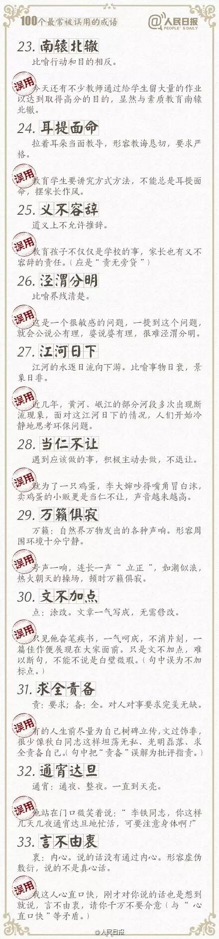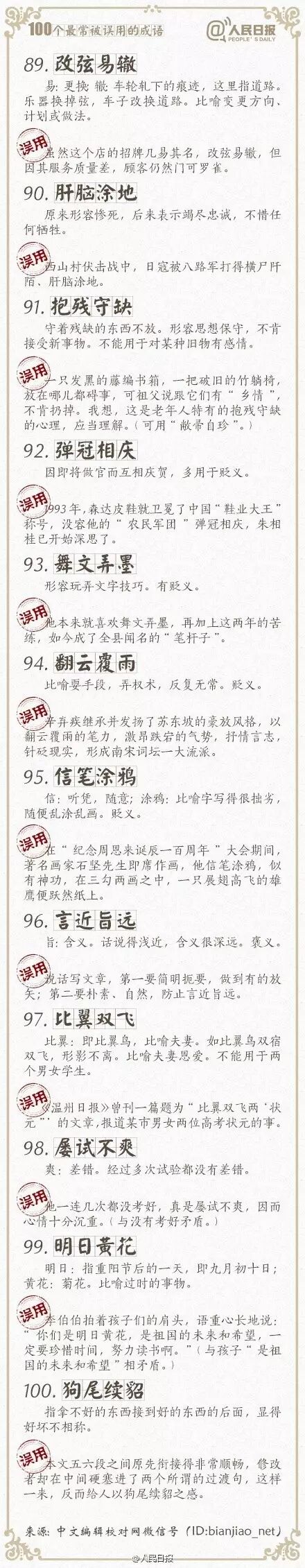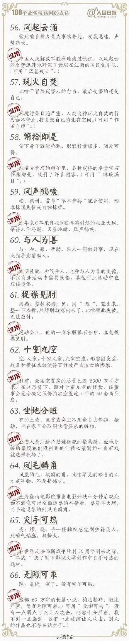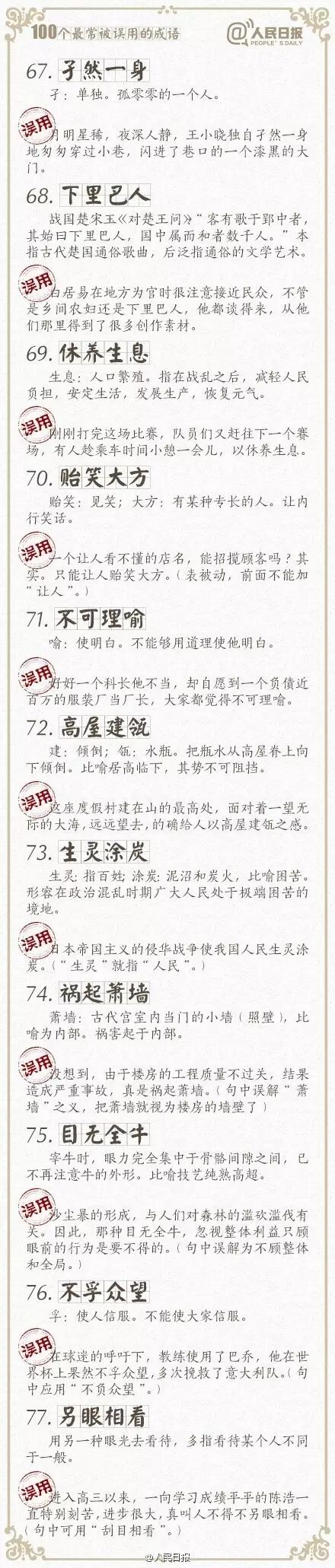 ①万人空巷:形容盛大集会或轰动一时的情景;②改头换面:比喻只改形式不改内容,贬义;③不情之请:不合情理的请求,常用作客套话;④差强人意:大体上还能够使人满意…工作生活中,成语被误用的情况不在少数。100个常被误用的成语,你用对了吗?快来一起学习吧!