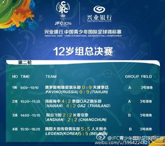 据微博“JFC青少年国际足球锦标赛”介绍,兴业银行中国青少年国际足球锦标赛的总决赛第二轮比赛已经全部结束,比赛在雨中进行。在19岁组总决赛第二轮比赛中,四支中国球队全部大比分告负,一共打入1个进球,但总丢球数高达52球。其中,三支中国球队被对手零封,只有华北电力打入一球。每支中国球队都被对手打入10个或10个以上进球。在第二轮比赛中失球最多的球队的是人大九五,竟然被德国柏林网足球队一场比赛打入21球。最终,人大九五以0-21的悬殊比赛负于德国柏林网足球队。而其它三支中国球队也都以大比分负于外国球队,华中科大0-10负于韩国青丘高中足球队,西南交大0-11负于韩国宝仁高中足球队,华北电力1:10负于巴基斯坦伊斯兰堡足协队。中国的大学生球队大比分负于韩国的高中球队,令人吃惊,发人深省。