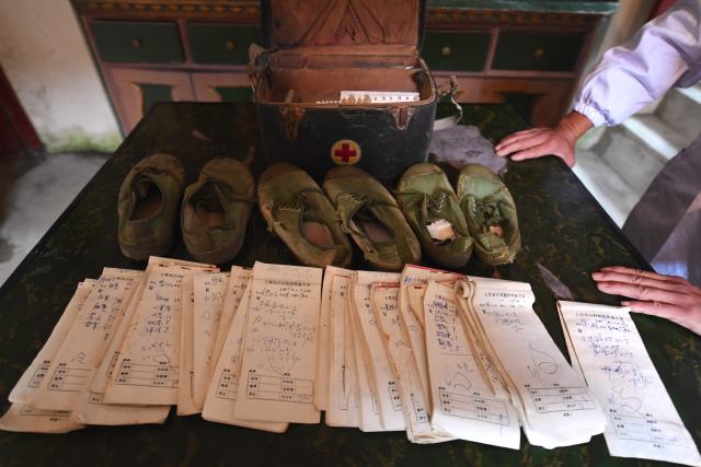 李勤如曾穿坏的解放鞋和出诊的部分单据(11月1日摄)。新华社记者 胡晨欢 摄