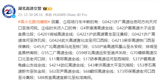 据湖北高速交警微博上午8时16分消息:因雾,①现场行车中断的有:G0421许广高速往岳阳方向天河口至淮河段。②临时关闭入口的有:G4京港澳高速全线;G42沪蓉高速木子店至宜昌北段;G4201绕城高速全线;G4221沪武高速青龙至汪集段;G0421许广高速淮河至珠玑段;G0424武大高速宣化店至河口西段;G4213麻安高速铁门西至保康段;G45大广北高速乘马岗至铁门段;G50沪渝高速凤凰山至永安段;排湖至宜昌桥南段;G55二广高速全线;G59呼北高速远安至渔洋关段;G70福银高速汉口北至老河口段;S11青郑高速全线;S17硚孝高速径河至西湖段;S37沪蓉高速龟峰山支线全线;S4214武红高速全线;S43孝洪高速太平至沉湖段;S53枣石高速新市至张金段;S63双尹高速全线;S68翻坝高速全线;S73邓保高速老河口西至冷集段;S88岳宜高速宜都北至松滋南段。