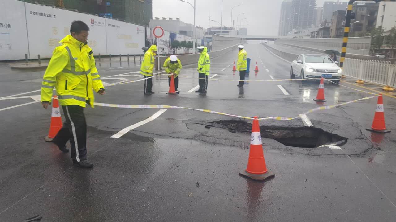 长江云报道 11月7日下午三时许,硚口区交通大队辅警王汉文、张征在古田桥汉口下桥处执勤,发现路面突然塌陷,呈现出一个桌面大小的深洞!当时这里车流量较小,车速相对较高,万一有车不慎驶入,后果不堪设想!他们立刻用电台向大队指挥室报告,并冒着大雨站在塌陷处当起“人体警示牌”。十分钟后,副中队长王胜带领3名民警和锥形筒、警戒带等工具到达现场,围出一片醒目的隔离区。四时许,施工抢险人员到达现场开始处置。