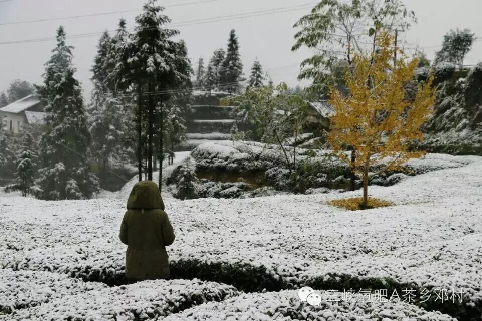 银装素裹的茶园引起了路人的关注