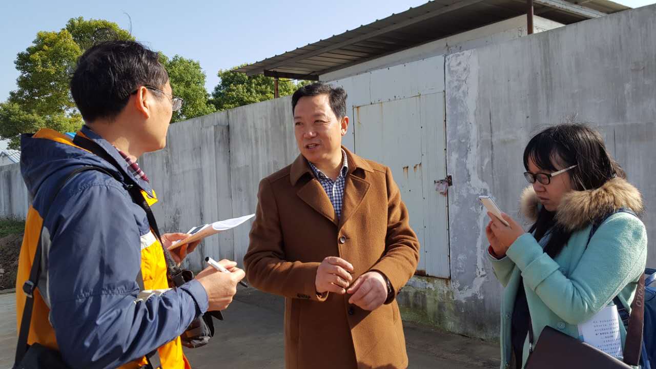 仙桃市新材料产业园管委会副主任曾军(中)向记者介绍企业治污情况