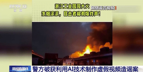 在一段网络视频中,一个工业园区发生火灾,现场火势猛烈。这个视频后续被证明是虚假的,是有人利用人工智能合成技术,将多段不同视频剪辑拼接而成的视频谣言。