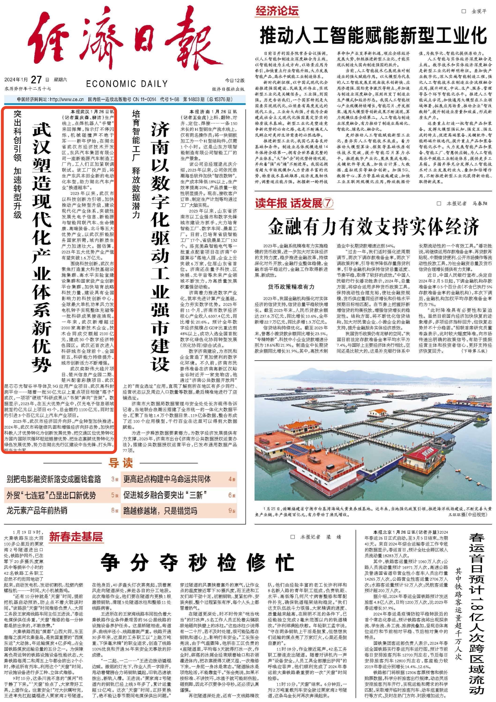 1月27日,《经济日报》头版刊登文章《武汉塑造现代化产业体系新优势》聚焦武汉市以科技创新为引领,加快推动产业转型升级,建设现代化产业体系。全文如下:
