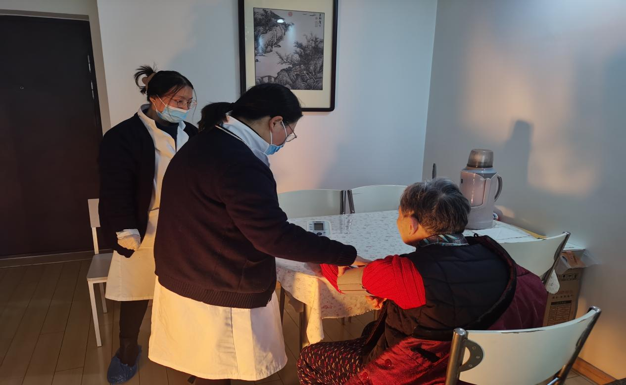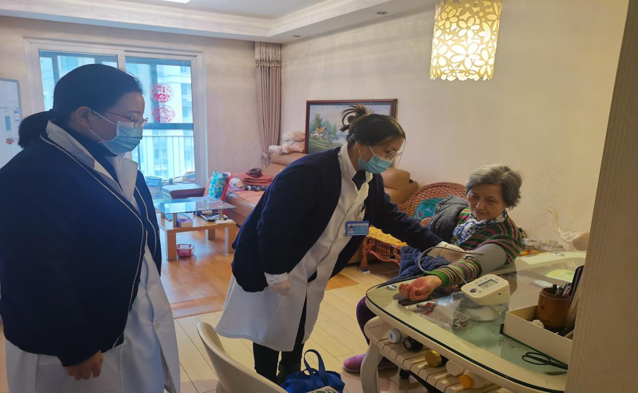 网格和医护人员走访多户独居、孤寡、行动不便的老年人,上门为其测量血压,了解其身体健康状况。在测量开始前,先询问老人是否了解自身血压状况,在得到回答后开始对老人进行血压测量,根据测量结果,对比老人先前所述情况,得出老人近期血压变化情况。测完血压后,医护人员根据老人的血压情况,给出相关降压建议,并提醒老人要按时服用降压药,时刻关注自身身体状况。
